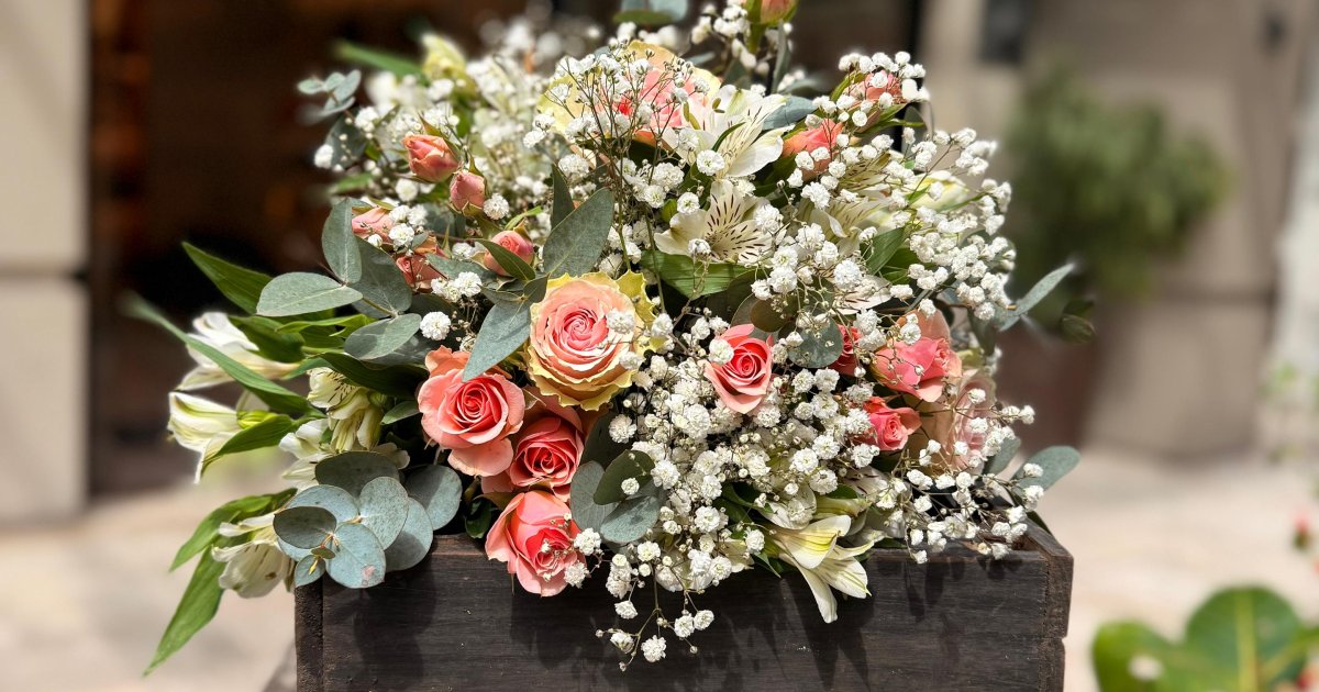 Las flores pueden variar según la estación y disponibilidad en el mercado, sin embargo, el concepto de "Encanto de mama" está presente en todas sus versiones