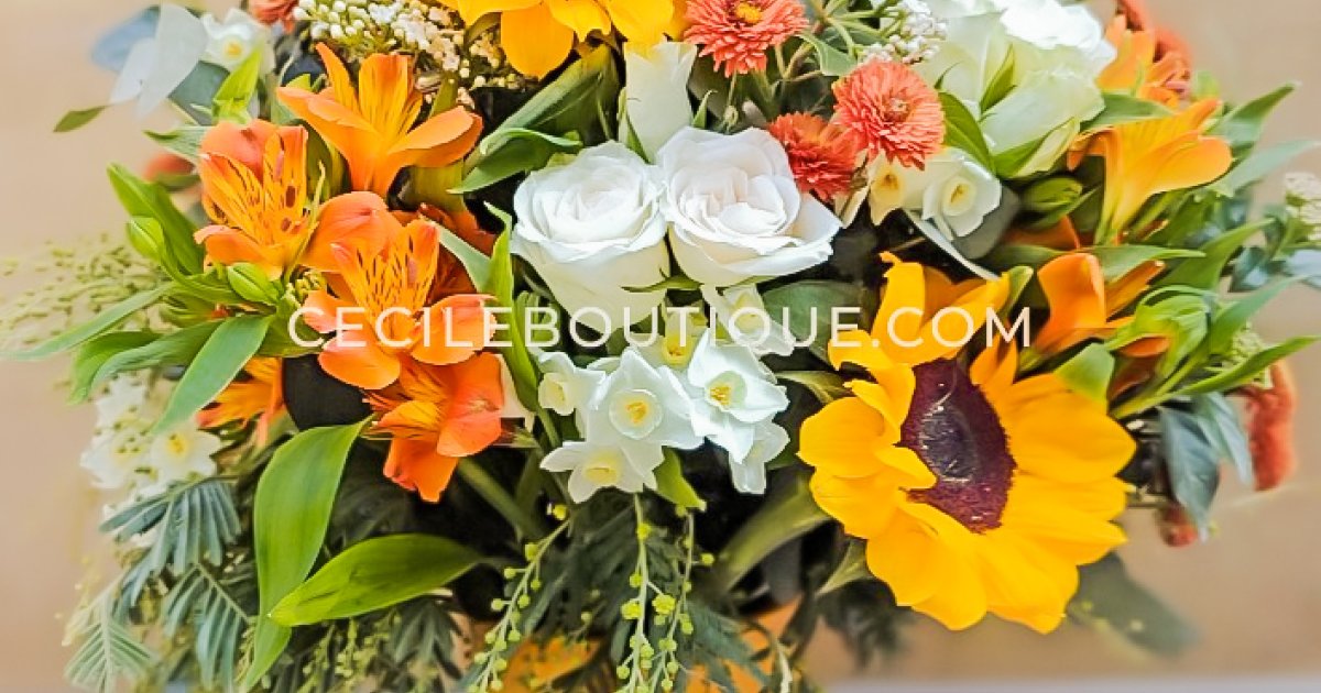 May contain: Sunflowers, Reddish Mini Cristanthemums, Orange Astromelias, Junquils, Roses and delicate foliage. Flowers may vary according to season and market availability. However, the concept of "Soles" remains present in all versions.