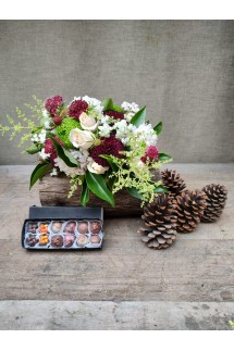 • Centerpiece: White, red, green, and yellow flowers, such as red tulips, white roses, and small yellow flowers, combined with natural foliage. Ideal for a low, fresh centerpiece that brings light and harmony to the dinner table.