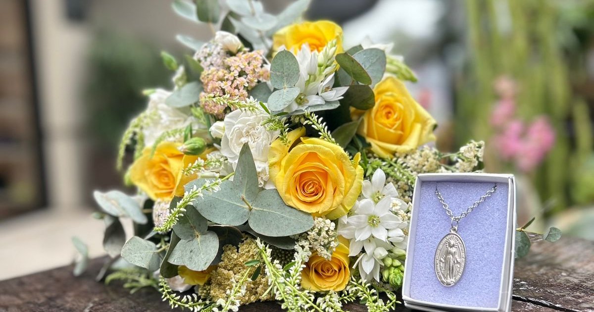“Ramo para María” es un regalo con un bouquet de flores naturales que incluye una medalla, pensado para transmitir luz, gratitud y serenidad. Los tonos del conjunto son amarillos, blancos y verdes, una combinación que inspira armonía y frescura. Es un ramo creado para envolver tu espacio en calma y resguardo. Ideal para regalar a un ser querido, para hacerle una ofrenda a la Virgen o acompañar momentos de fe y agradecimiento.