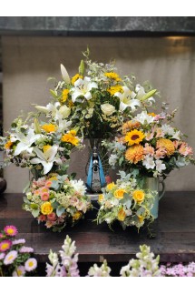 Ideal para acompañar una imagen o altar familiar, con orquídeas, margaritas y un follaje verde suave que aporta calma.• Ramo personalizado: