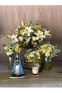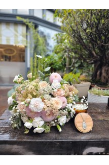 Una combinación armónica de lilis blancas, rosas claras y hortensias celestes. Delicado, puro y tradicional.• Centro de mesa: