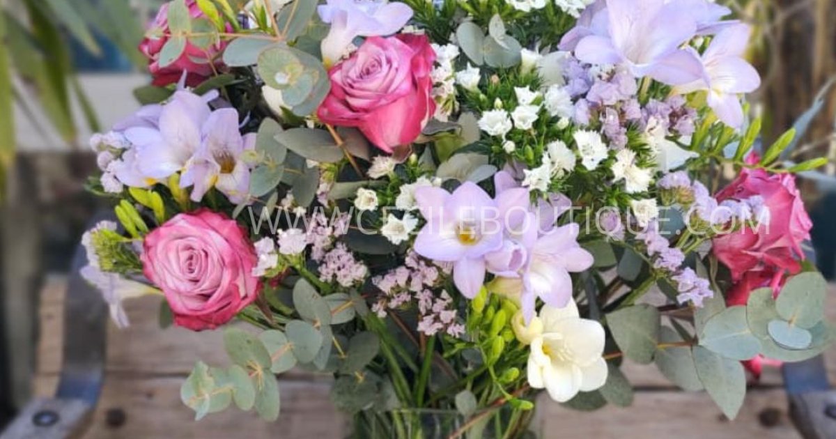 "Jardín de fresias" ramo con diseño sutil, delicado, ideal para regalar a la mujer que valora los pequeños detalles de arte en un arreglo floral.