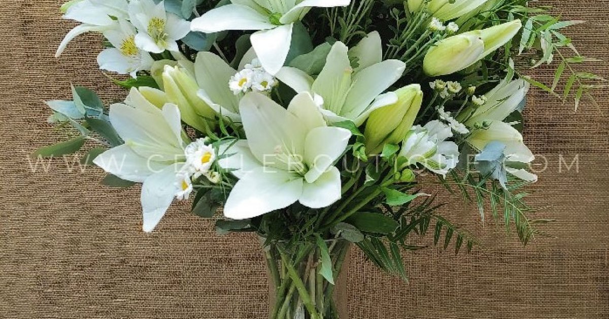 Ele pode conter: Lilliums, Astromelias e folhagens que lhe dão o equilíbrio perfeito. As flores podem variar de acordo com a estação e a disponibilidade no mercado. Entretanto, o conceito por trás do "Rosário" está presente em todas as versões.