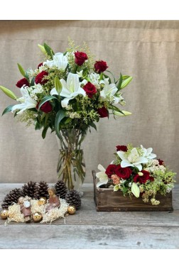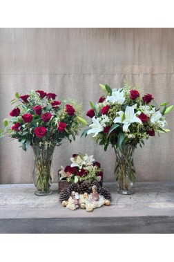 "Deixe Seu Natal Brilhar" é um conjunto que inclui dois buquês, um buquê de flores frescas e uma vel..