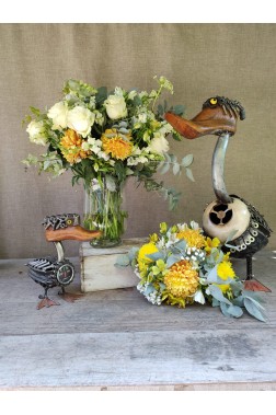“Mergulho Dourado” é um presente com um bouquet de flores naturais que inclui dois arranjos e duas e..