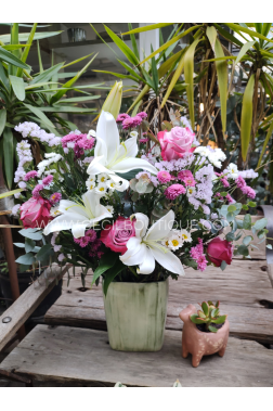 "Dulzura" es un hermoso ramo petite en tonos violetas y rosados, ideal para obsequiar y acompañ..