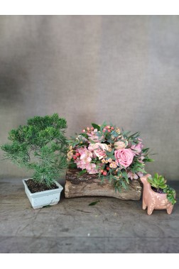 Calma es un bouquet que transmite paz al instante. Sus suaves tonos pastel, combinados con un vibrante toque de rosa, tienen el poder de iluminar tu día o el de alguien especial. Además, incluye un bonsái símbolo de vida y paciencia y un jardin, este regalo es una invitación a la serenidad y al equilibrio.
